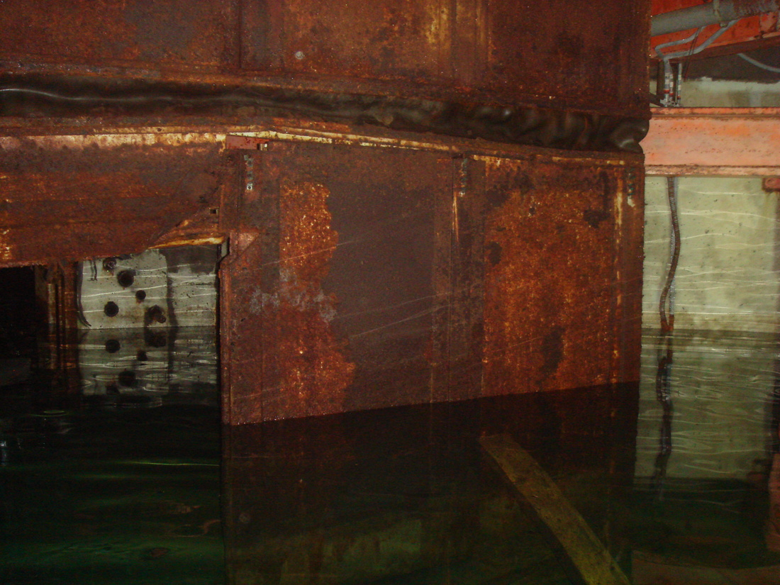 Cautiously we approached the silo tunnel, both of us hoping we could slip through the claustrophobic gap, but as we got closer, our optimism took leave of us. We tried laying flat against the kayak to fit through the opening and slowly edged forward. "There is no way we're going to fit through there", Walter groaned as a shower of crimson rust flakes rained down on us both forcing our eyes tightly closed as we brushed the top of the tunnel. Thwarted and cursing, we backed awkwardly from the tunnel. We were not getting through there without going under. The nearby floating corpse of a mouse confirmed I wasn't prepared to do that. Yuck! We decided to try our hands at the equipment terminal which appeared to have a bit more clearance than the silo entrance and Walter steered us over to the opening where once again we laid flat and pulled ourselves forward using whatever rusty bits of metal we could grab.
