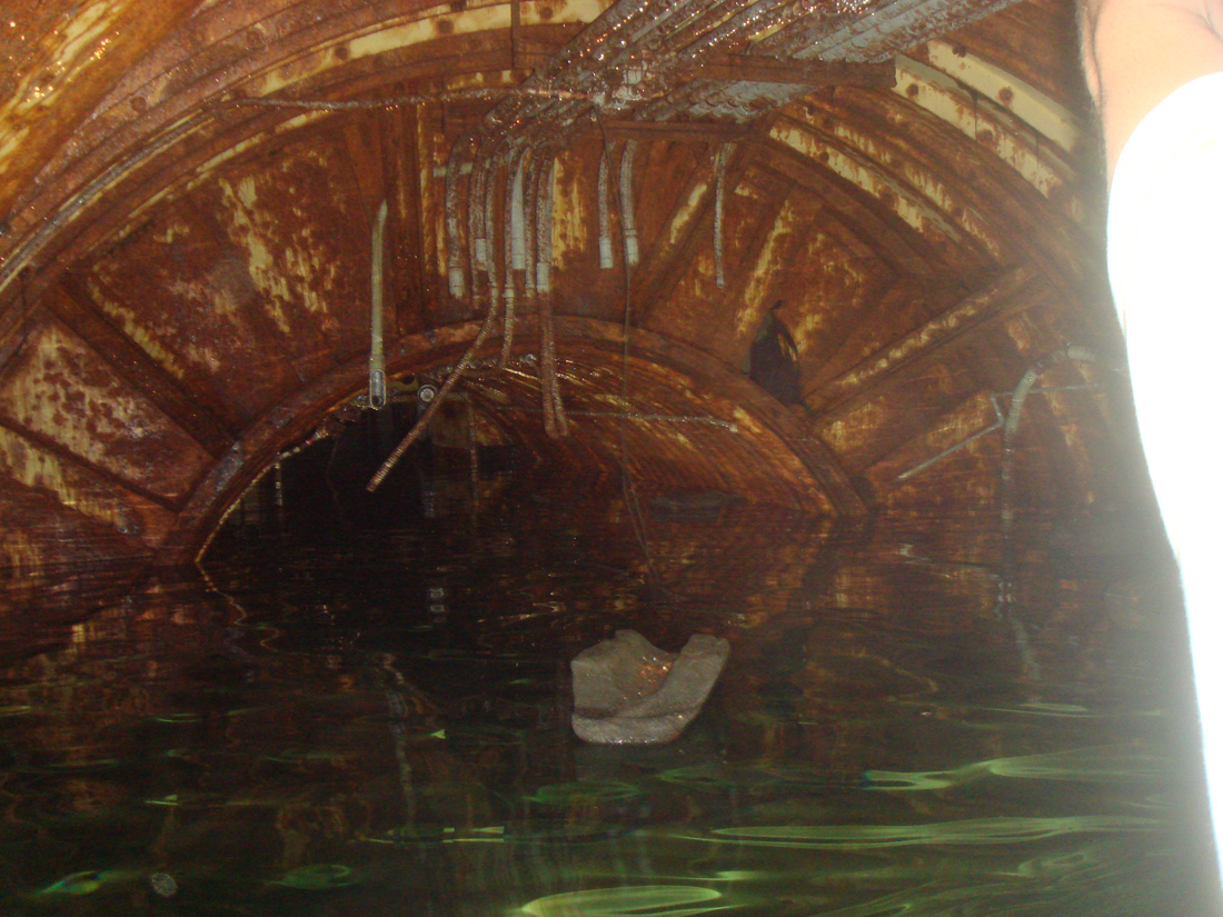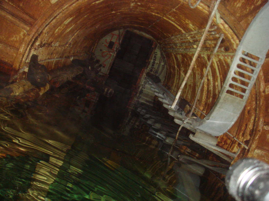 As we sailed silently into the tunnel junction between the silo and equipment terminal, it was clear the water level had gone up, or rather, the tunnel had gone down. The relative elevations of the various tunnels, terminals and other features varies from one location to another. The tunnels that usually appear level are in fact sloping upward or downward depending on where you are and which direction you are facing. This particular length of tunnel had been sloping downward disconcertingly as we neared the tunnel junction.