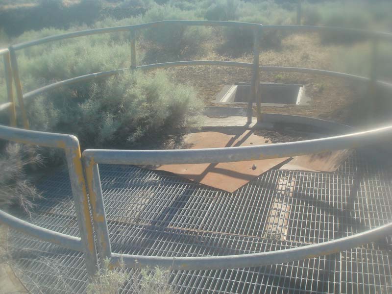 Death on the Silo On the way back, we made what was for me, a fateful stop at the propellant terminal which involved laying flat once more in order to fit through the very small opening of he flooded tunnel. Once inside, I took some video of the interior, all the while completely unaware of the misfortune which had befallen me. We were faced by the same tight squeeze as we had seen at silo #2 only just a bit easier to pass through. As we went to leave, I turned on my camera to take a few more shots and discovered water dripping from it. Oh dear... I tried to take a photo, but the usual display and simulated shutter sounds were silent. I opened the battery compartment and cursed vigorously as I found more water inside. My camera, it was no more. It was clear that when I'd ducked under the tunnel opening to enter the propellant terminal, the camera, which was held to my wrist by a flimsy strap, had gotten thoroughly dunked as we entered. I tried to take a photo but when I looked at the result, this is what I saw: I tried my soggy camera again. Only the faintest hint of the scene could be discerned amidst the murky image that resulted. I had failed in my duty to protect my camera-- the same camera I had brought back with me from Japan after lying to customs agents about buying it there to sidestep fees. We headed back outside to get some water and warm up a bit before heading to the other 2 launchers and I did my best to let my camera dry out in the sun in hopes of reviving it. It didn't work. Hours later I took the following photo: The results were not encouraging. The flash no longer worked, no doubt having fried itself with its own high voltage charge, and the image had taken on a permanent ghostly fog probably thanks to deposits left on the CCD by the water. CRAP!!! I was forced to switch to my smaller, crappier camera for the remainder of the trip, including 568-A-- a whole different Titan I site. Not good. The camera was purchased in Den-Den town (aka: Nipponbashi), Osaka's sprawling consumer electronics marketplace and faithfully took over 5000 photos in and around Osaka, Nishinomiya, Tokyo, Kyoto, Kobe, Himeji, and the volcanic wonderland of Beppu on the southern island of Kyushu before meeting this sad end in the waters of 568-C. It was and is deeply missed. After a brief respite topside, we dove back into the compelling and soggy underworld of Larson 568-C leaving my fallen cam-rade behind. Next stop: Launcher #3.