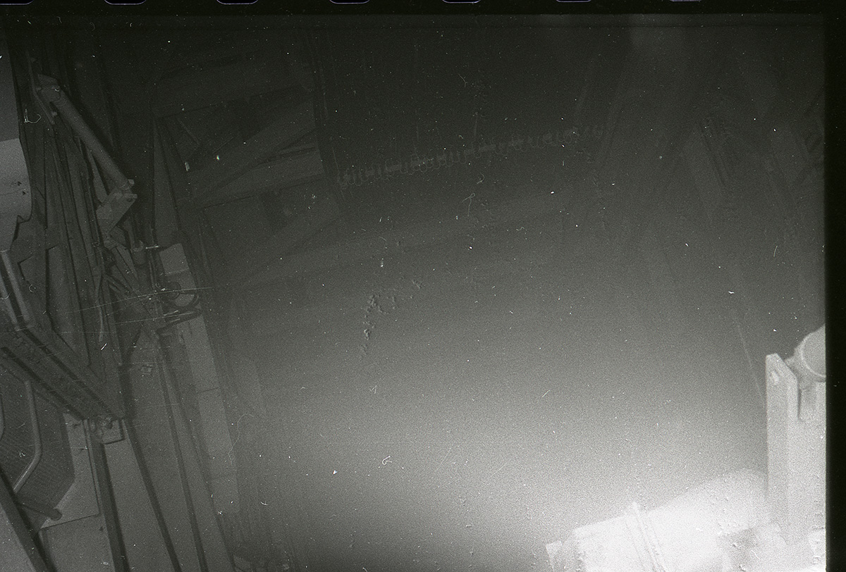Unknown squadron, site and launcher undergoing salvage operations. Presumed to be taken in the early 1970's, this photo shows the view from inside face C of the cribwork looking down the empty silo at umbilical cabling on face A from beneath the raised missile platform. There is a raised work platform visible on the left side of the photo. Note: photo negative appears to have water damage and exposure problems. Please contact me at chromehooves@hotmail.com if you have any information on this photo. Any help identifying this or any other photos in the archive is greatly appreciated. Taken: Unknown-- probably late 1960's to early 1970's. Source: provided courtesy of the Titan Missile Museum/Nick Halliday (http://www.titanmissilemuseum.org/)
