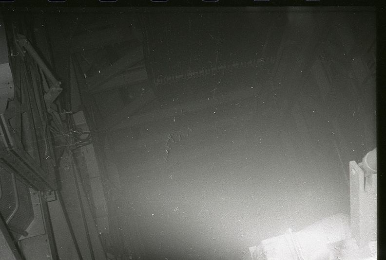 Unknown squadron, site and launcher undergoing salvage operations. Presumed to be taken in the early 1970's, this photo shows the view from inside face C of the cribwork looking up toward the bottom of the launcher platform at the idler pulleys and enormous wire ropes that raised and lowered the missile. Elevator umbilical loop cabling on face A is visible in the background extending down into the silo. Please contact me at chromehooves@hotmail.com if you have any information on this photo. Any help identifying this or any other photos in the archive is greatly appreciated. Taken: Unknown-- probably late 1960's to early 1970's. Source: provided courtesy of the Titan Missile Museum/Nick Halliday (http://www.titanmissilemuseum.org/)