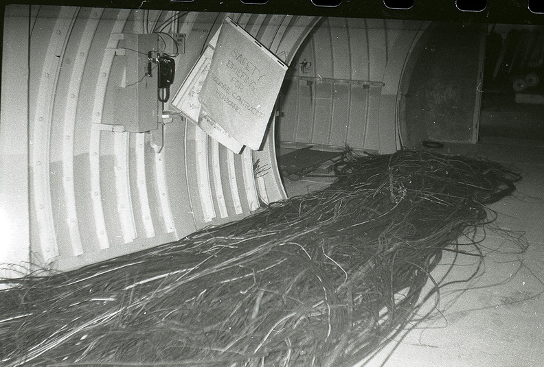 (1 of 2) Unknown AMF engineer about 20' below the silo doors inspects hydraulic lines from the catwalks on face D of the silo cribwork at an unknown site and launcher. Launcher appears to be under construction or undergoing engineering modifications in this photo as evidenced by the safety netting spanning the gaps between the cribwork and silo wall. This photo illustrates the impressive confluence of hydraulic lines and manifolds at this upper level of the cribwork required to drive the many locks, jacks, platforms and other functions of the silo lift system. Taken: unknown Source: The Martin Co.?