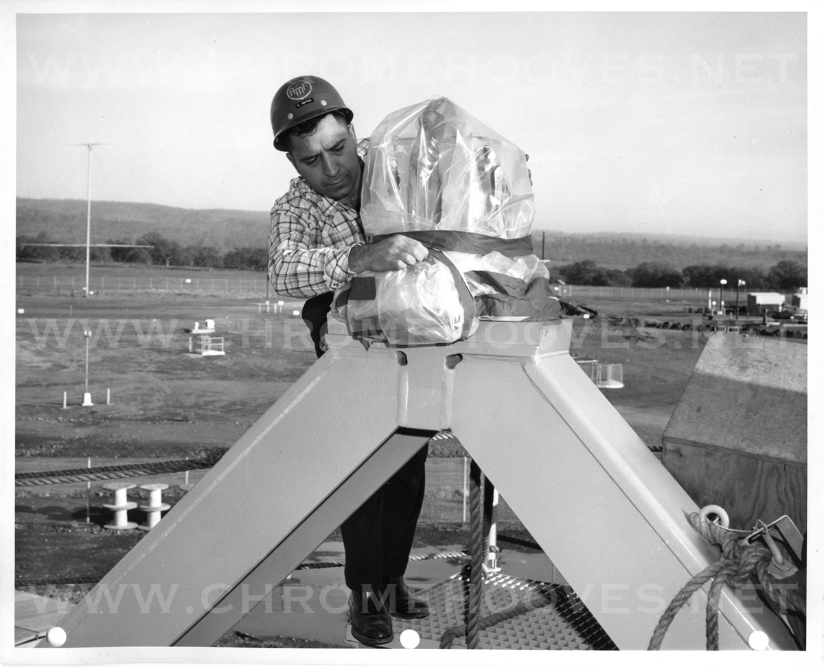Construction photo of launcher #1 at an unknown site and squadron, most likely Lowry 724th or 725th or Beale 851st. AMF engineer G. Soffer stands on the missile platform which has been raised to the surface. He is shown working with one of the four missile restraining mechanisms where he appears to be removing protective plastic.