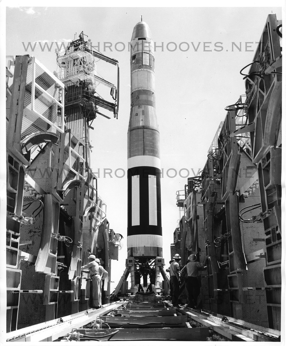 Thought to be Captive Firing Stand 2 in operational status-- one of four captive firing stands at the Martin Denver facility, photo shows the missile from the retracted gantry. Taken: April 1959. Source: Martin Co.