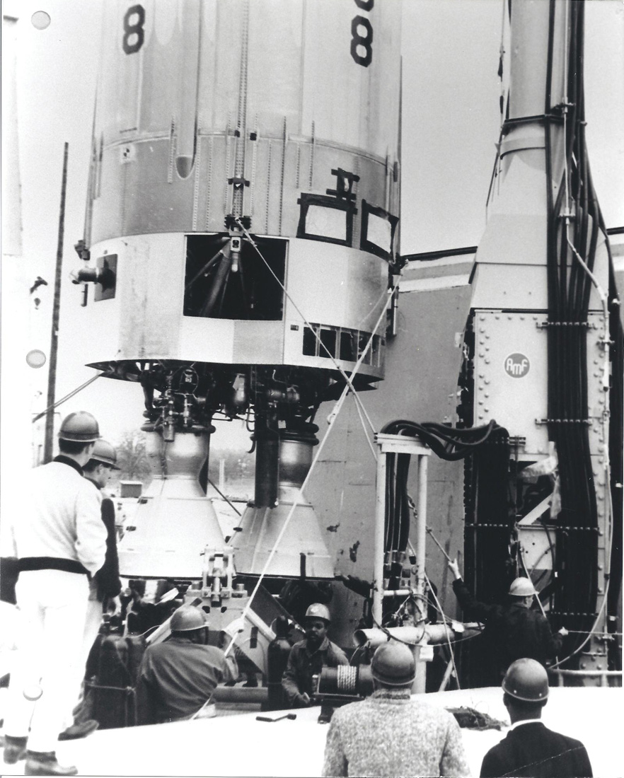 Missile installation at Beale 851st SMS. Site and launcher unknown. First stage is being lowered into position for mating to the missile platform. Taken: circa 1961 Source: Unknown Photo courtesy of Joseph Viscuso