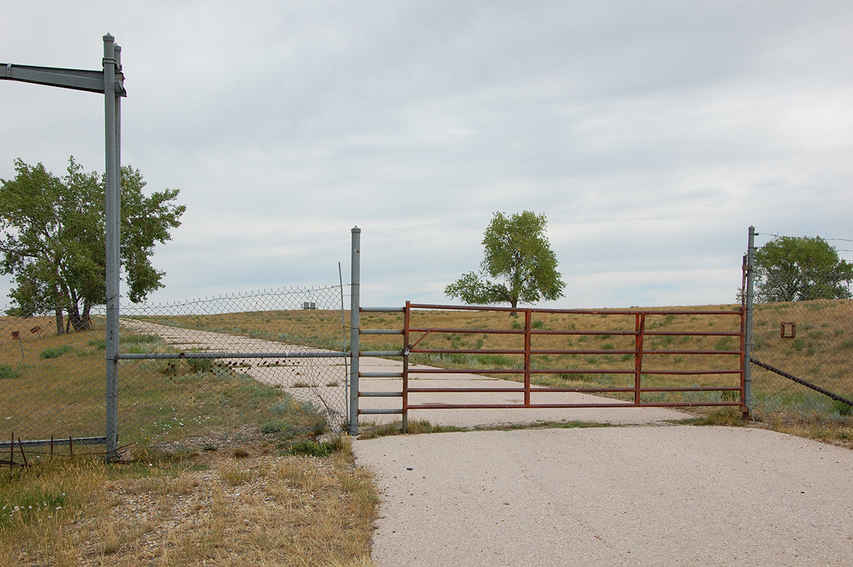 Main gate at Ellsworth 850-A. Original gate has been replaced. A small security portal can be seen to the right of the gate that allowed passage of mail, paperwork and small parcels and was secured with a locking box or panel (now absent). Orientation target can be seen through the fence in the distance. Taken: 2012 Source: Lars Fichtner-Lorenz