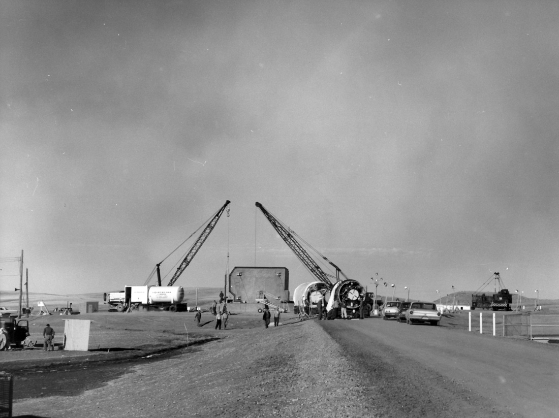 Missile installation at Ellsworth 850-A, launcher #2 showing cranes and support equipment as both stages of the airframe wait to be unloaded from their transport trailers and prepped for emplacement on the missile platform. In this photo, the missile platform has not yet been raised to the surface. Taken: circa 1963 Source: Art LeBrun