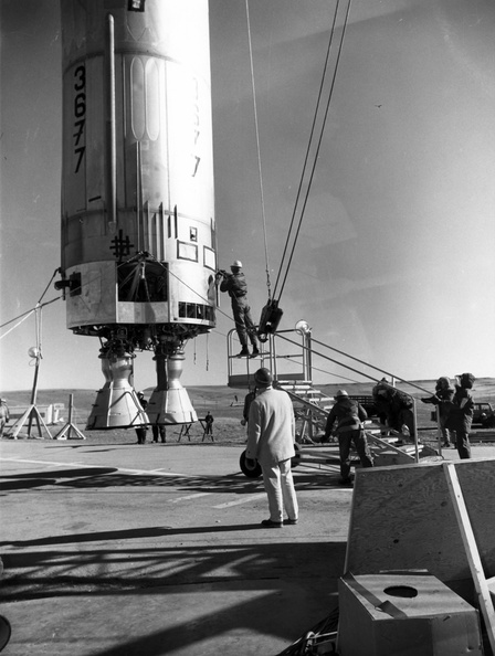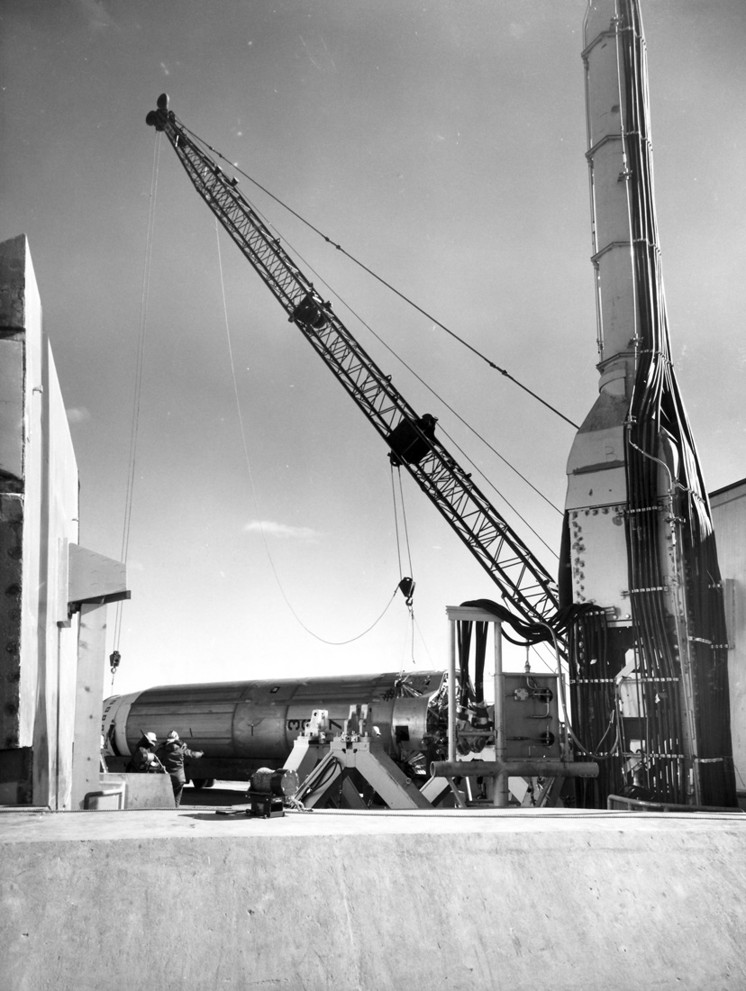 Missile installation at Ellsworth 850-A, launcher #2. Missile platform has raised to the surface for emplacement of 1st stage seen being rigged up to cranes for installation. Umbilical tower base is visible on the right. Taken: circa 1963 Source: Art LeBrun