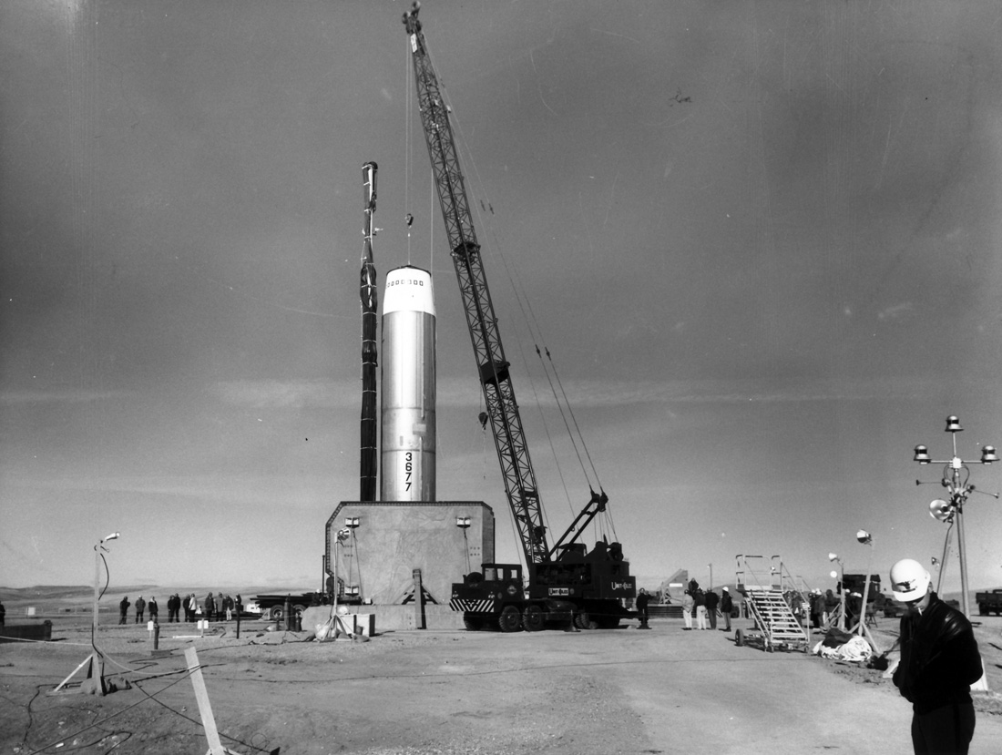 Missile installation at Ellsworth 850-A, launcher #2. First stage being emplaced on the missile platform. Taken: circa 1963 Source: Art LeBrun